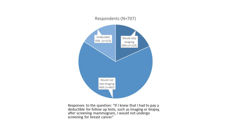The survey also asked whether respondents would forgo the initial screening mammography exam if they knew they would have to pay a deductible for follow-up tests. Of 707 respondents, 129 (18.3%) said they would skip the screening mammography exam, 465 (65.8%) would not skip mammography, and 113 (16.0%) were undecided.