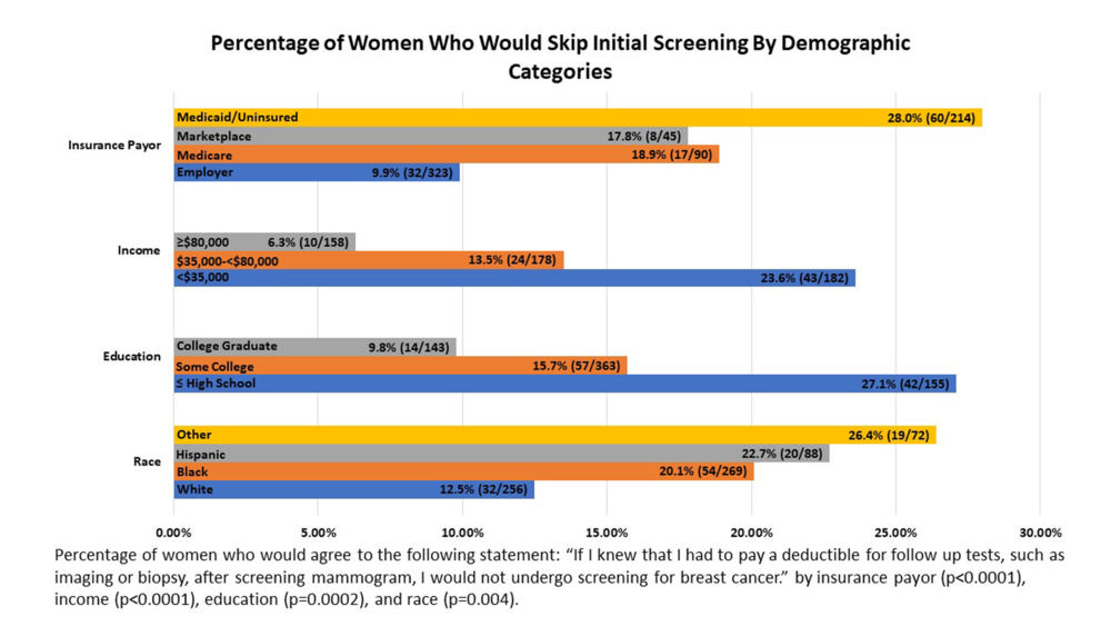 For the study, the researchers surveyed 932 patients presenting for breast imaging at Boston Medical Center between September 2021 and February 2022. The survey was comprised of demographic questions on race, education level, annual household income and insurance payor, as well as scenarios about utilization of breast imaging. There was a variable response rate on questions.