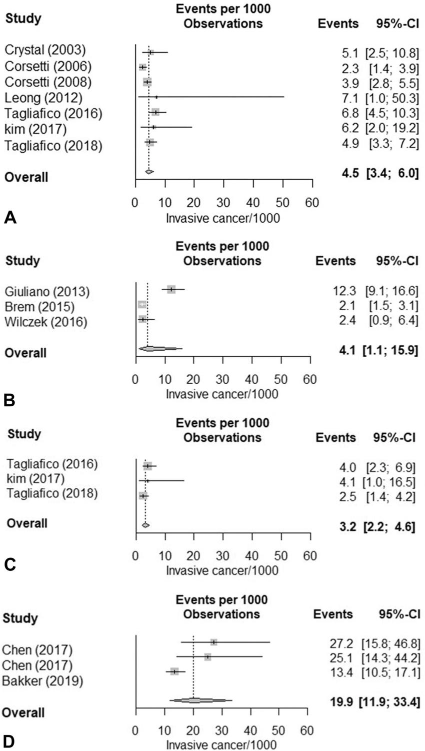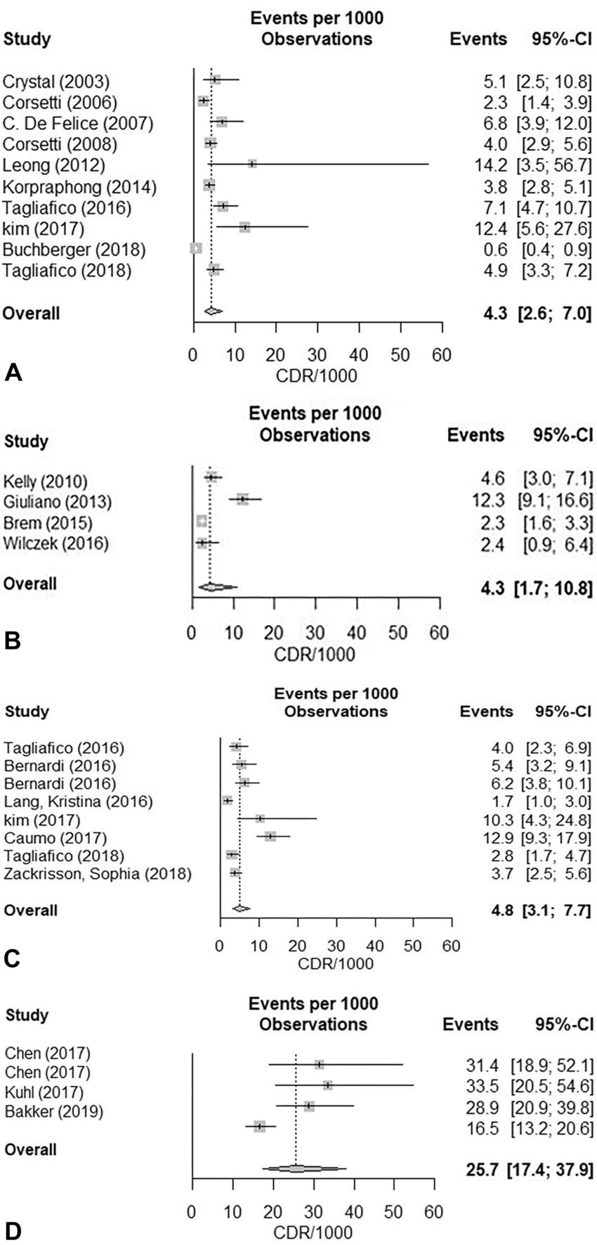 Meta-analysis showed that of the 132,166 patients with dense breasts, a total of 541 breast cancers that were initially missed on mammography were detected with supplemental screening methods. Breast MRI was the superior screening method and was capable of detecting even the smallest of cancers. Excluding MRI, there was not a significant difference between the other supplemental screening methods.