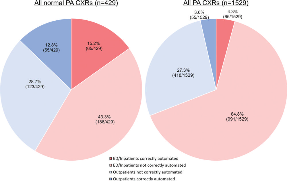 The AI tool performed especially well at identifying normal X-rays of the outpatient group at a rate of 11.6%. This suggests that the AI model would perform especially well in outpatient settings with a high prevalence of normal chest X-rays.