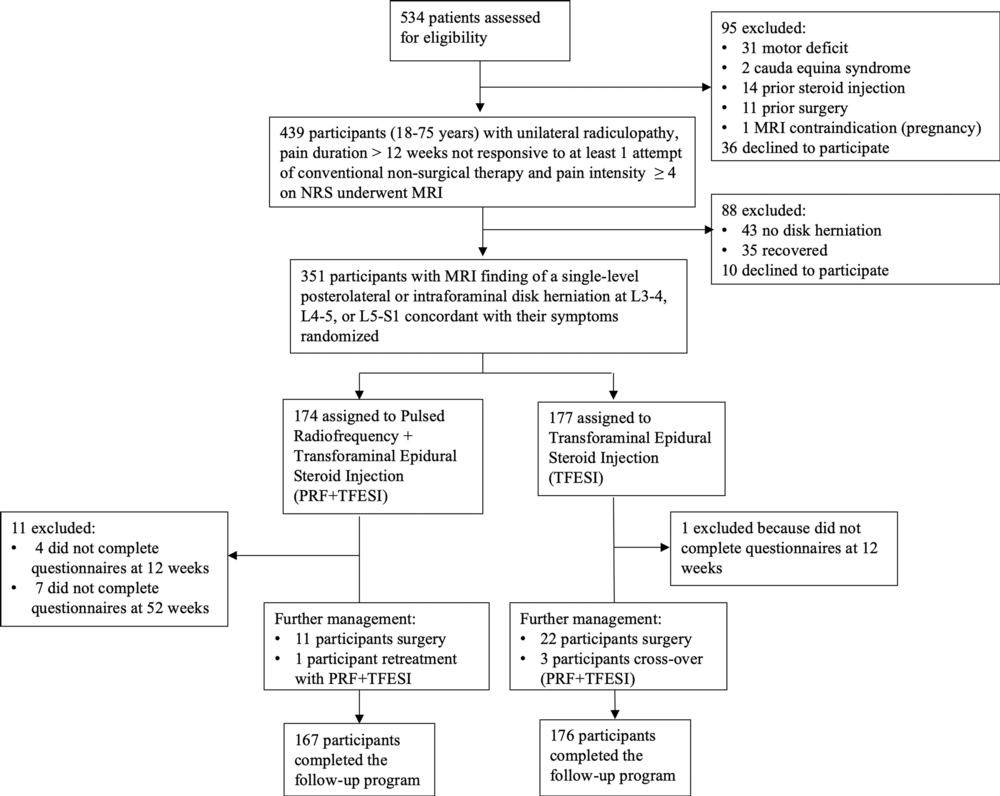 For the multicenter randomized trial, researchers wanted to determine the difference in effectiveness between pulsed radiofrequency combined with TFESI versus the steroid injection alone for sciatica pain lasting 12 weeks or longer and not responsive to conservative treatment in patients with due to lumbar disc herniation.