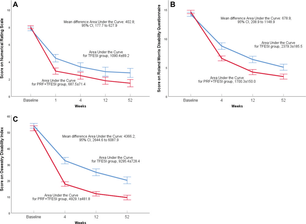 At four, 12, and 52 weeks there was greater leg pain reduction and greater disability improvement in participants who received pulsed radiofrequency combined with TFESI compared to the participants who only received the steroid injection.