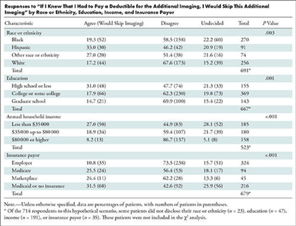 The groups with the highest percentage of responses indicating they would skip additional imaging were Hispanic (33.0%), high school educated or less (31.0%), household income less than $35,000 (27.0%) and Medicaid/uninsured (31.5%).