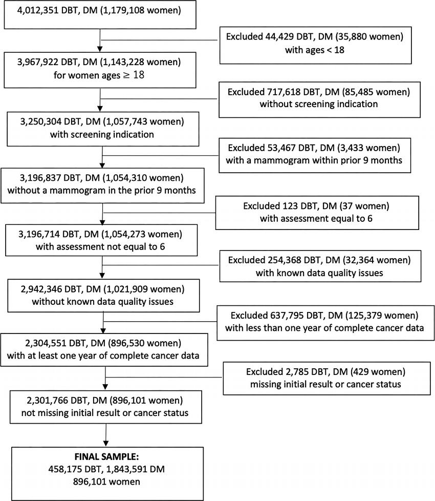 A total of 896,101 women undergoing 2,301,766 screening exams—458,175 DBT and 1,843,591 2D digital mammography—were included in the retrospective study. The abnormal interpretation rate was 8.3%, cancer detection rate was 5.8 per 1,000 exams, sensitivity was 87.4%, and specificity was 92.2%.