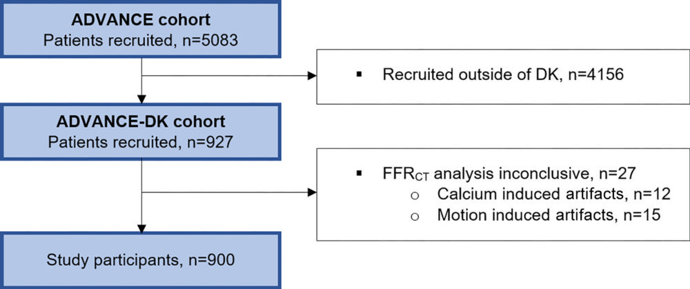 The study group included patients with new onset stable coronary artery disease consecutively enrolled in the Assessing Diagnostic Value of Non-Invasive CT-FFR in Coronary Care (ADVANCE) clinical trial between December 2015 and October 2017 at three Danish sites. Eligibility factors for the trial included at least one coronary artery stenosis, or narrowing, greater than 30% and no atrial fibrillation (irregular heartbeat) or prior coronary revascularization, which is a procedure or surgery that improves blood flow to the heart.