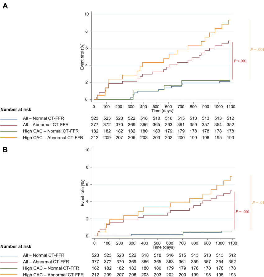 Among the participants with normal CT-FFR results and a high coronary artery calcium score, the three-year adverse outcome rate was 2.2% (4/182). Participants with a high coronary artery calcium score and abnormal CT-FFR results had a 9% (19/212) three-year adverse outcome rate.