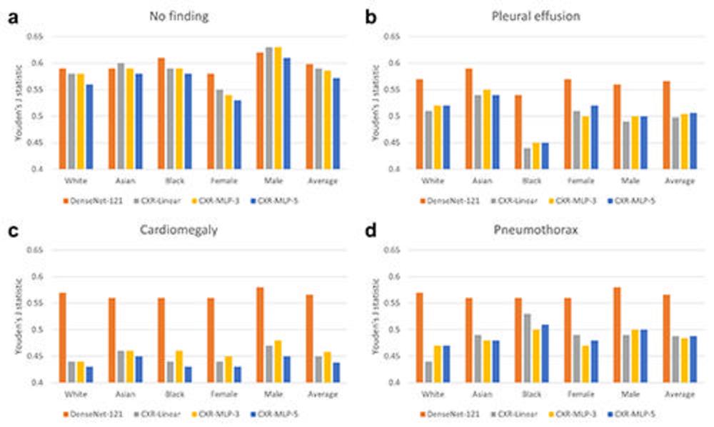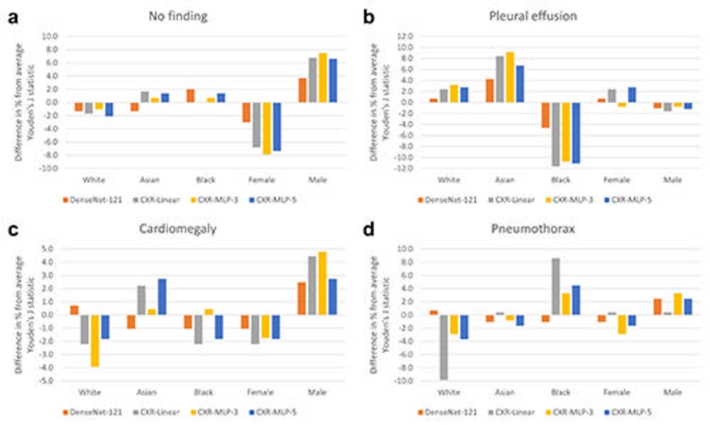 Significant differences were found between male and female and Asian and Black patients in the features related to disease detection. Compared with the average model performance across all subgroups, classification performance on the 'no finding' label dropped between 6.8% and 7.8% for female patients, and performance in detecting 'pleural effusion'—a buildup of fluid around the lungs—dropped between 10.7% and 11.6% for Black patients.