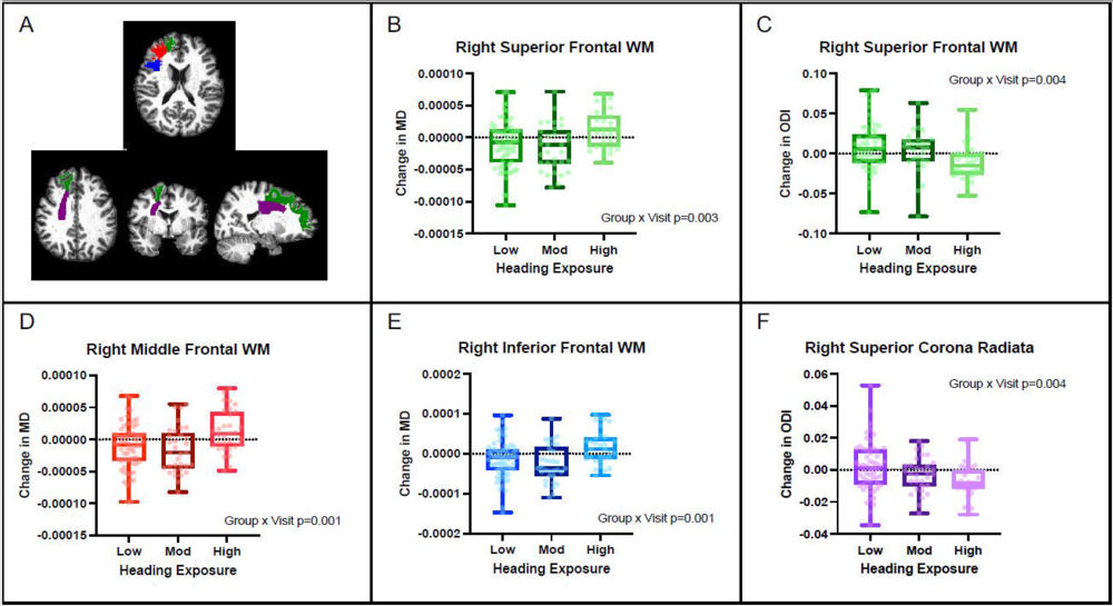 Compared to the baseline test results, the high-heading group (over 1,500 headers in two years) demonstrated an increase of diffusivity in frontal white matter regions, and a decrease of orientation dispersion index (a measure of brain organization) in certain brain regions after two years of heading exposure. The analysis adjusted for variables including age, sex, education and concussion history.