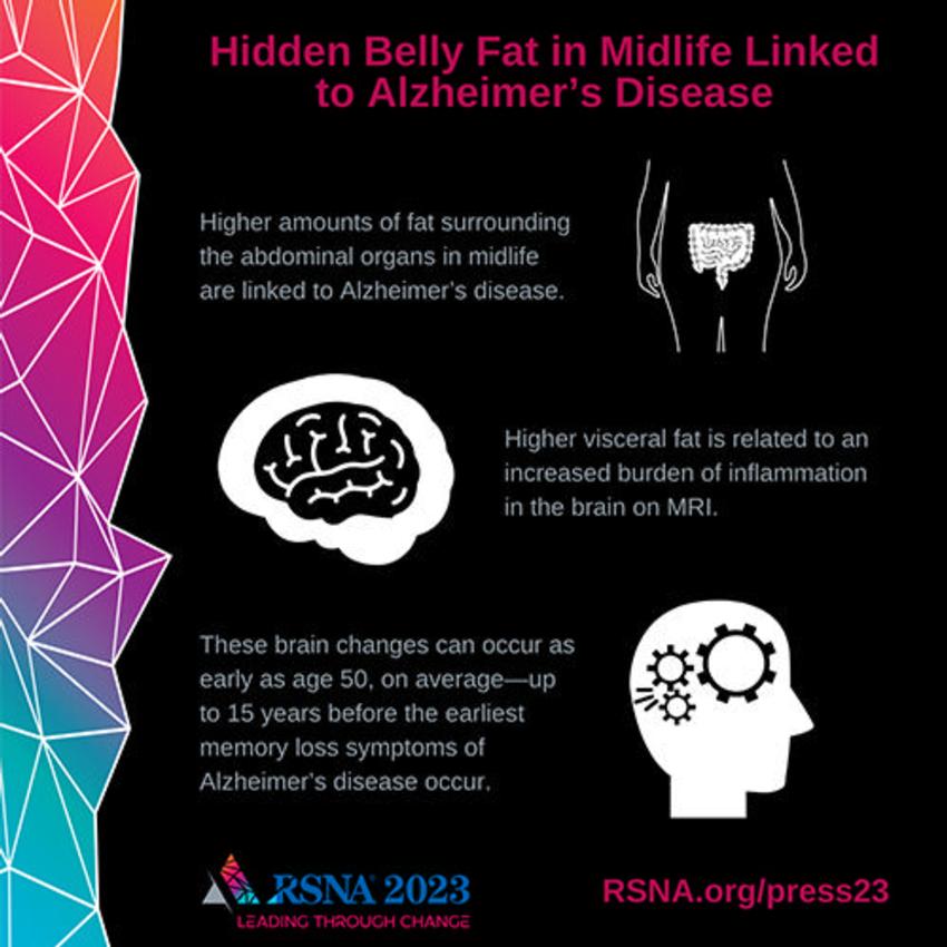 CHICAGO — Higher amounts of visceral abdominal fat in midlife are linked to the development of Alzheimer's disease, according to research being presented next week at the annual meeting of the Radiological Society of North America (RSNA). Visceral fat is fat surrounding the internal organs deep in the belly. Researchers found that this hidden abdominal fat is related to changes in the brain up to 15 years before the earliest memory loss symptoms of Alzheimer's disease occur.