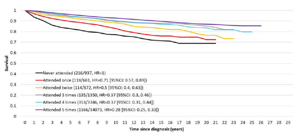 Women who attended all their invited screening mammograms had a survivability rate of over 80%. Women who didn’t participate in any screenings had a survival rate that ranged from 59.1% to 77.6%.