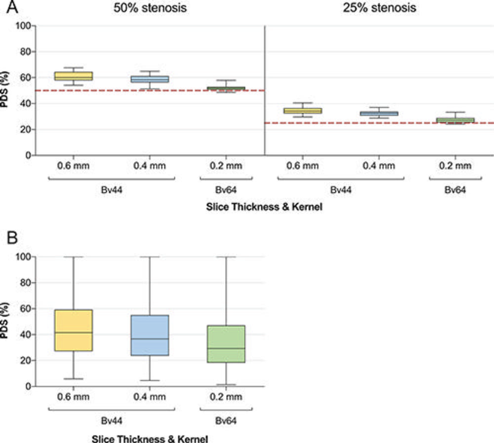 For the study, researchers evaluated coronary stenoses, or narrowing in the coronary arteries, in a vessel phantom (in-vitro) containing two different stenosis grades (25%, 50%), and retrospectively in 114 patients (in-vivo) who underwent ultrahigh-spatial-resolution cardiac PCD-CT for the evaluation of coronary artery disease. In-vitro values were compared to the phantom's manufacturer specifications, and patient results were assessed regarding effects on coronary artery disease reporting and data system reclassification (CAD-RADS).