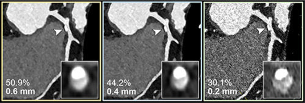 Dr. Emrich explained that ultrahigh-spatial-resolution may address the current limitations of conventional cardiac CT angiography by reducing the overestimation of stenosis due to calcium blooming, an effect which can cause small, high-density structures—such as calcifications—to appear larger than their true size.