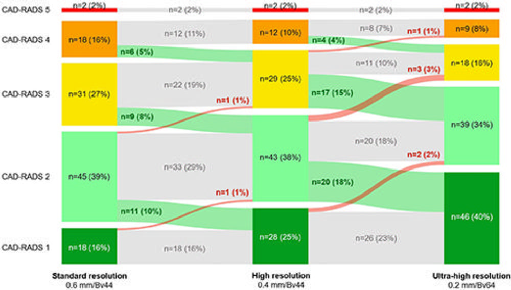 Results from the patients with suspected or diagnosed coronary artery disease confirmed a lower median degree of stenosis for calcified plaques (29% vs. 42%) with ultrahigh-spatial-resolution PCD-CT compared to standard CT. Ultrahigh-spatial-resolution often led to patients being reclassified to a lower CAD-RADS category. Of the 114 patients, 54% were given a lower CAD-RADS classification than they were originally assigned. The researchers found in-vitro quantification of the 193 coronary CT angiography-based stenoses was also more accurate using ultrahigh-spatial-resolution than standard resolution.