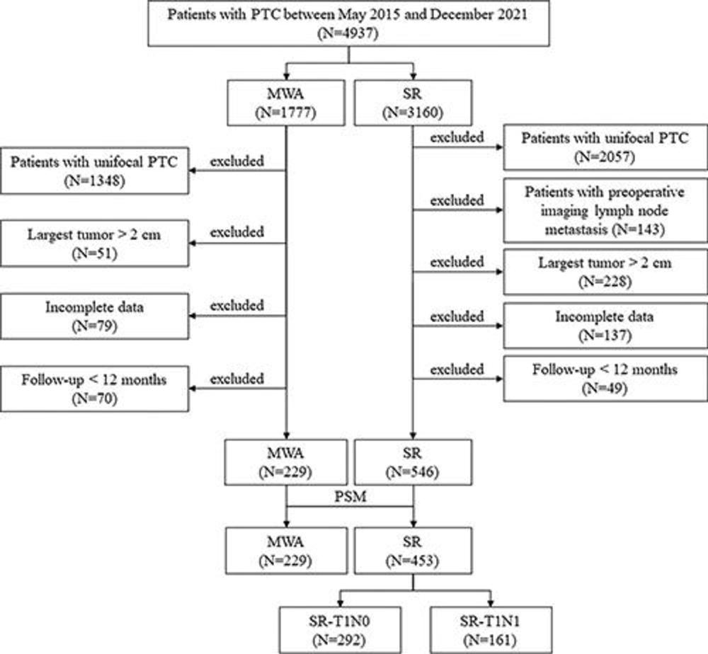 Researchers looked at 775 patients with ultrasound-detected multifocal Stage I PTC treated with microwave ablation or surgery across 10 centers between May 2015 and December 2021. Propensity score matching—a technique used to compare groups with potentially different baseline characteristics—was performed, followed by comparisons between the two groups. Propensity score matching helps reduce bias by creating comparable groups, allowing for a more reliable assessment of the treatment effect.