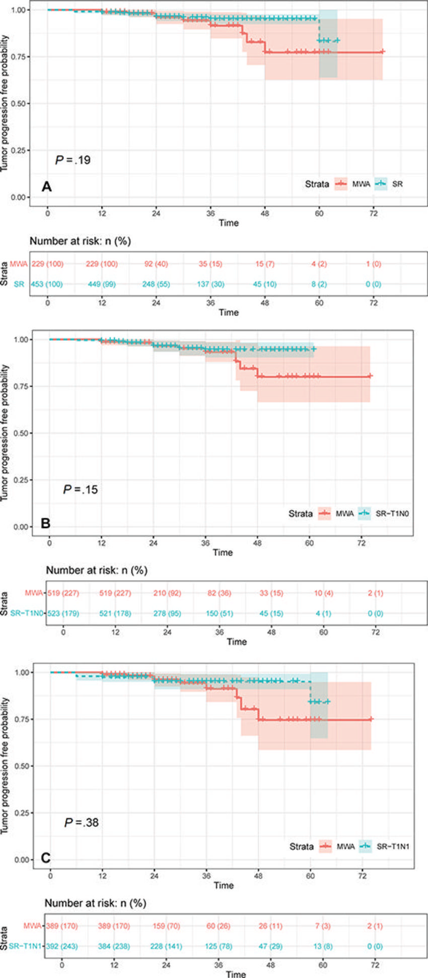 After propensity score matching, 229 patients in the microwave ablation group and 453 patients in the surgical resection group were followed for a median of 20 months (range 12-74 months) and 26 months (range 12-64 months), respectively.