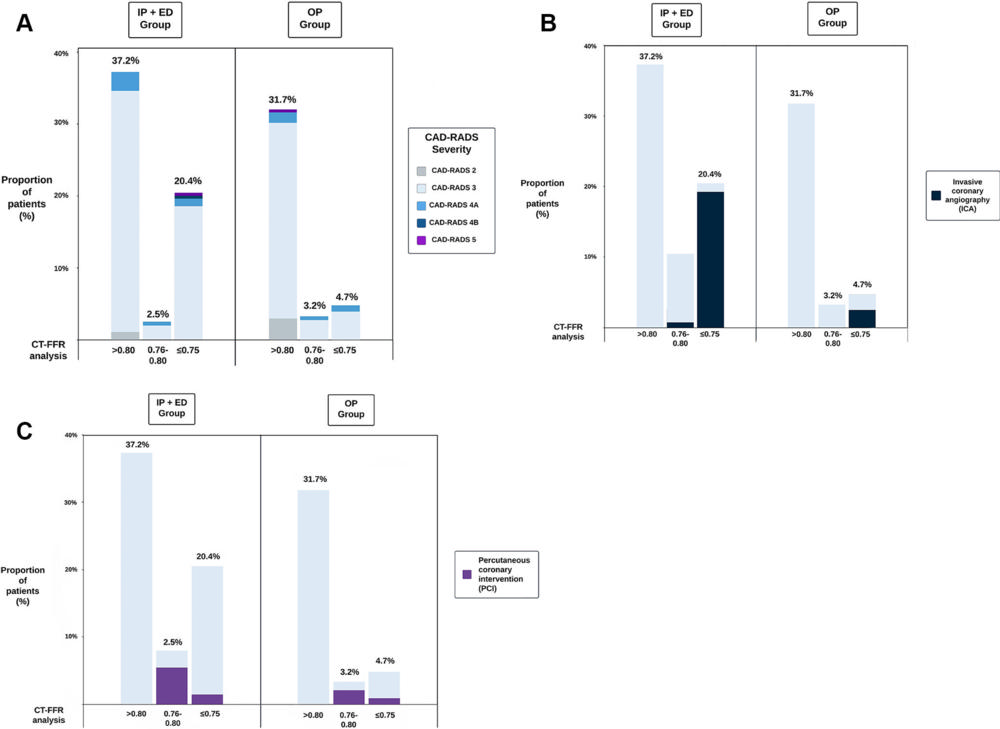 Patients with significant narrowing/blockages on coronary CTA who underwent CT-FFR had lower rates of invasive coronary angiography (25.5% vs. 74.5%) and subsequent percutaneous coronary intervention (21.1% vs. 78.9%) than patients who were not referred for a CT-FFR.