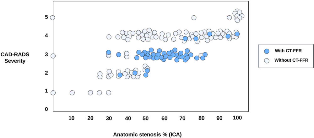 As expected, most referrals to CT-FFR were patients with scores of 3 or above. CT-FFR was requested in the majority (73.5 %) of patients with a score of 3 (moderate narrowing/blockage).
