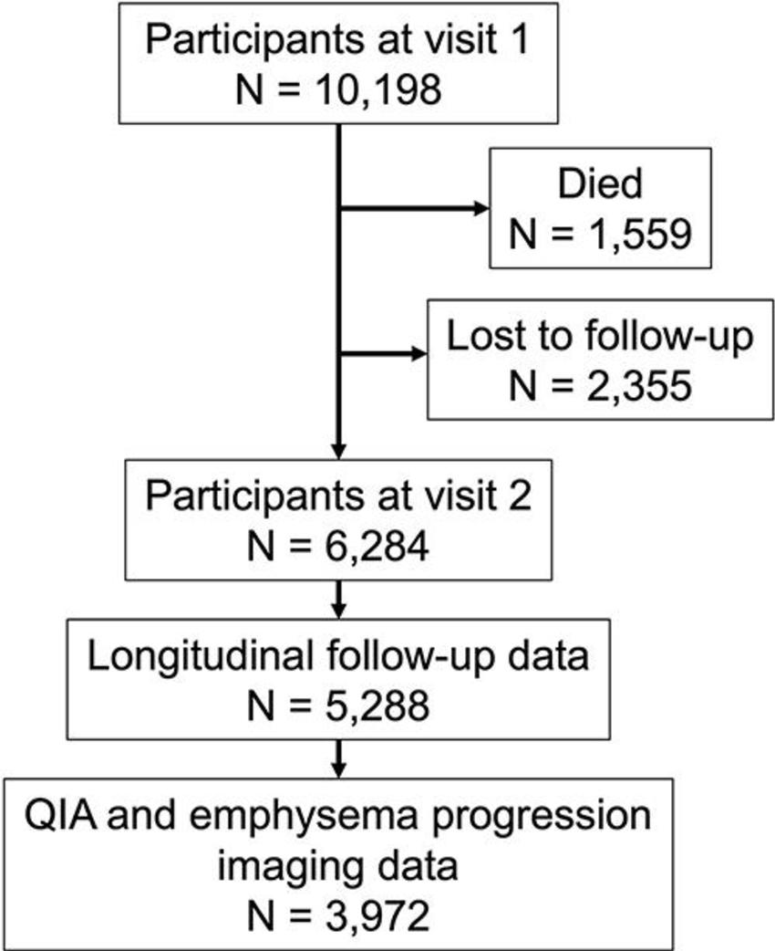 QIA was measured with machine learning-based tools as a percentage of lung volume on a CT scan. QIA progression was assessed using the participants' QIA measurements at baseline and five-year follow-up CT exams.