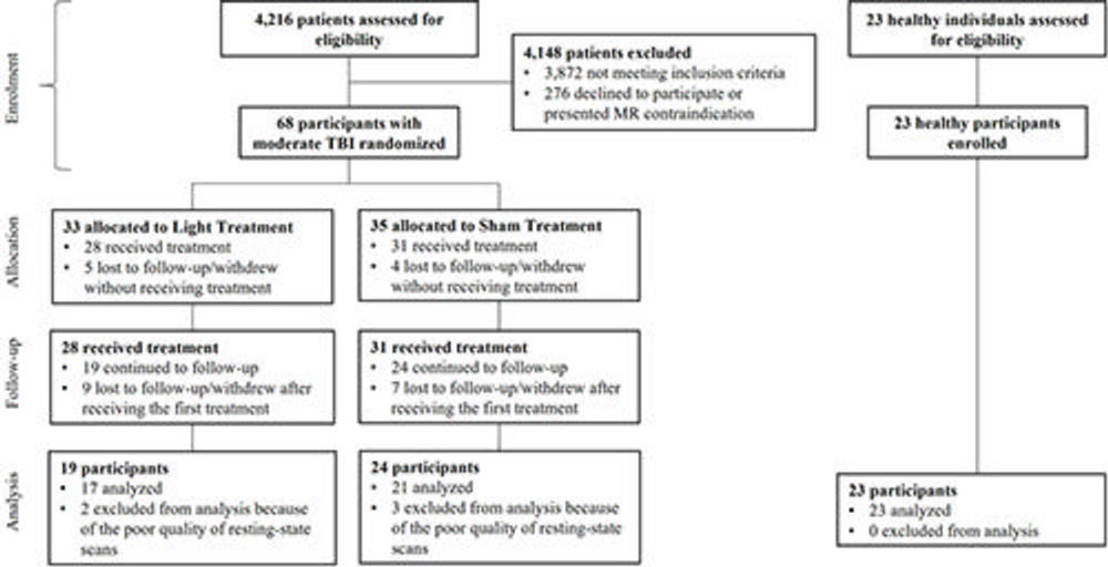 The researchers used an imaging technique called functional MRI to gauge the effects of the light therapy. They focused on the brain's resting-state functional connectivity, the communication between brain regions that occurs when a person is at rest and not engaged in a specific task. The researchers compared MRI results during three recovery phases: the acute phase of within one week after injury, the subacute phase of two to three weeks post-injury and the late-subacute phase of three months after injury.