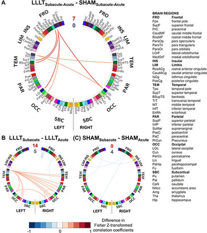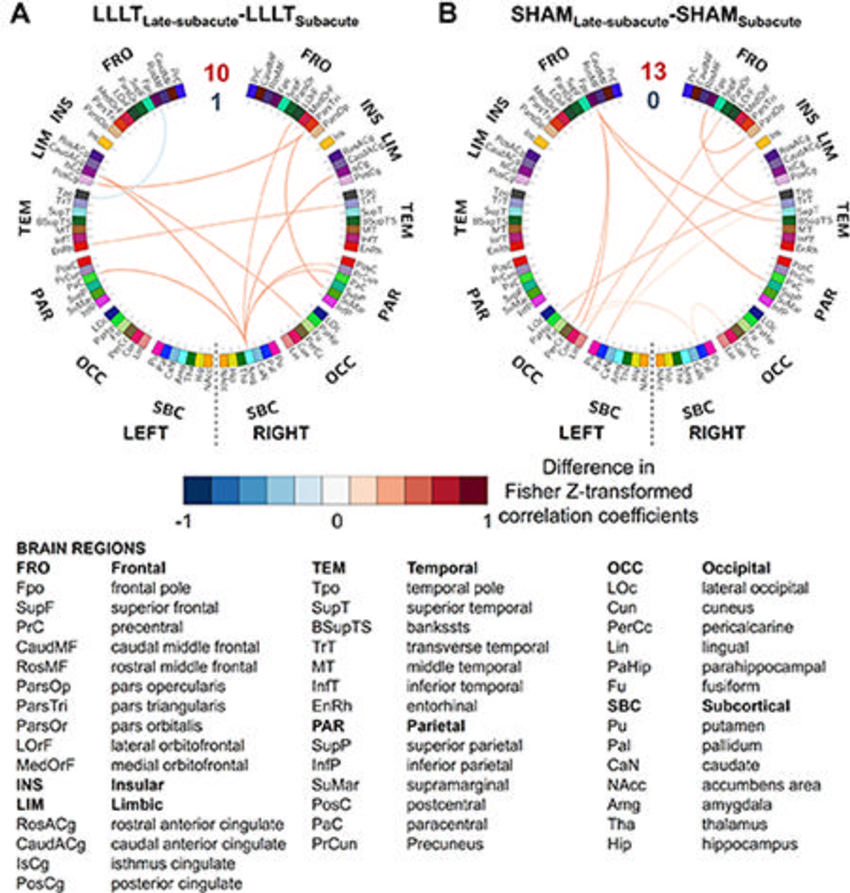 Patients who received low-level light therapy showed a greater change in resting-state connectivity in seven brain region pairs during the acute-to-subacute recovery phase compared to the control participants.