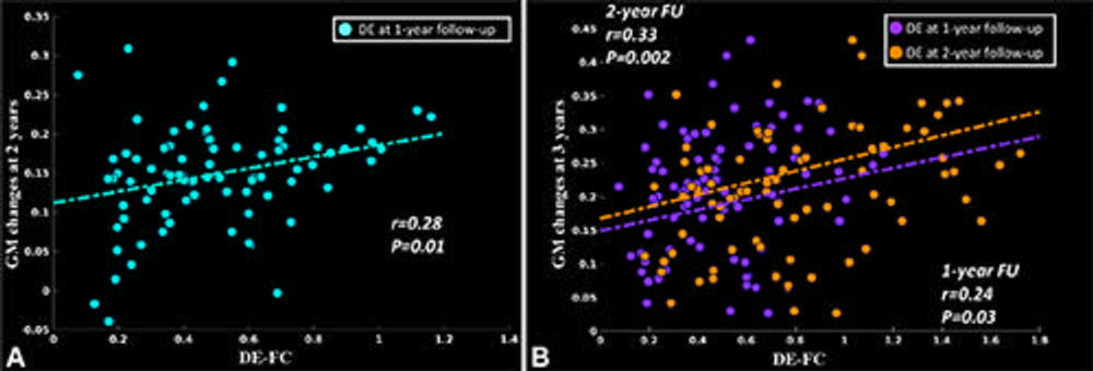 Disease exposure at one year and two years was correlated with atrophy at two years and three years post-baseline. Models including disease exposure predicted gray matter atrophy accumulation over three years in several areas of the brain.