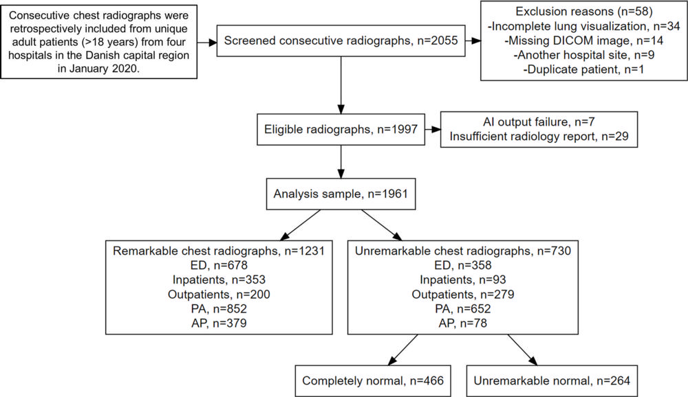 Researchers in Denmark set out to estimate the proportion of unremarkable chest X-rays where AI could correctly exclude pathology without increasing diagnostic errors. The study included radiology reports and data from 1,961 patients (median age, 72 years; 993 female), with one chest X-ray per patient, obtained from four Danish hospitals.