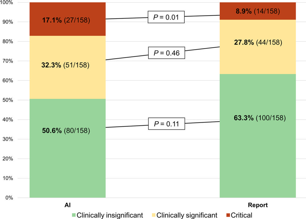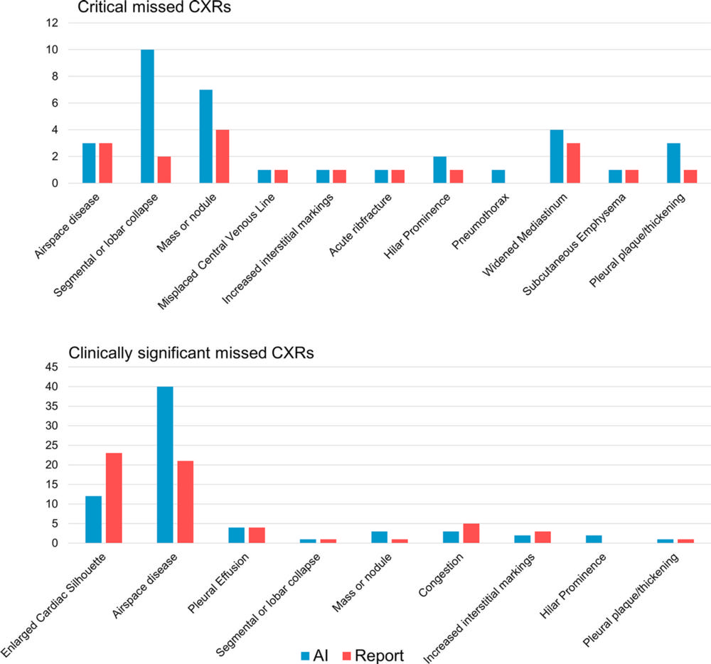 Two chest radiologists, who were blinded to the AI output, labeled the chest X-rays as “remarkable” or “unremarkable” based on predefined unremarkable findings. Chest X-rays with missed findings by AI and/or the radiology report were graded by one chest radiologist—blinded to whether the mistake was made by AI or radiologist—as critical, clinically significant or clinically insignificant.