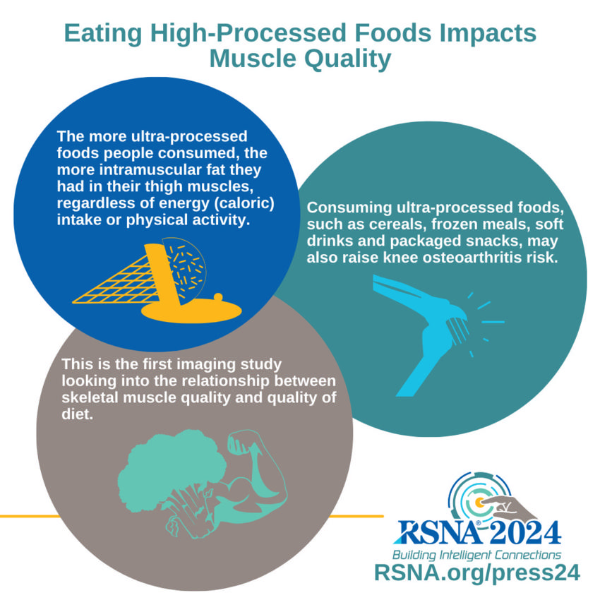 CHICAGO — A diet high in ultra-processed foods is associated with higher amounts of fat stored inside thigh muscles, regardless of the amount of calories consumed or level of physical activity, according to a study being presented today at the annual meeting of the Radiological Society of North America (RSNA). Higher amounts of intramuscular fat in the thigh could also increase the risk for knee osteoarthritis.