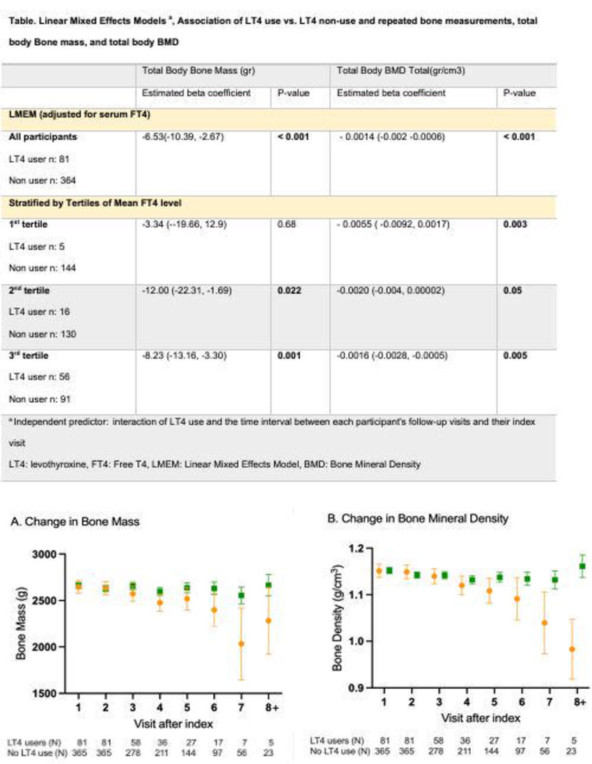 The results showed that levothyroxine use was associated with greater loss of total body bone mass and bone density—even in participants whose TSH levels were within the normal range—over a median follow-up of 6.3 years. This remained true when taking into account baseline TSH and other risk factors.