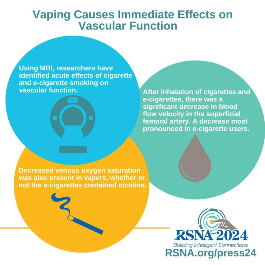 CHICAGO — Researchers have identified acute effects of cigarette and e-cigarette smoking on vascular function, even without nicotine. The results of the ongoing research are being presented next week at the annual meeting of the Radiological Society of North America (RSNA).