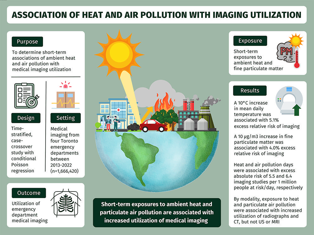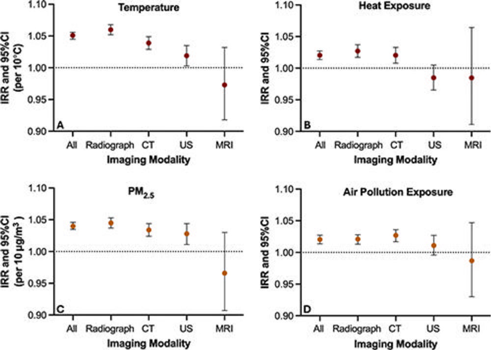 The researchers found that short-term (fewer than seven days) exposures to higher ambient (outdoor) heat and higher PM2.5 air pollution were associated with overall increases in imaging utilization (5.1% and 4.0%, respectively). High heat exposure days and high air pollution exposure days were associated with excess absolute risk of 5.5 and 6.4 imaging studies per 1 million people at risk per day, respectively.