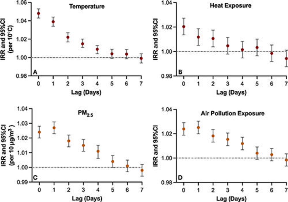For the purposes of the study, high heat was defined as a mean ambient temperature greater than 68 degrees Fahrenheit. A high level of air pollution was defined as the presence of fine particulate matter (PM2.5) at levels greater than 12 μg/m3.