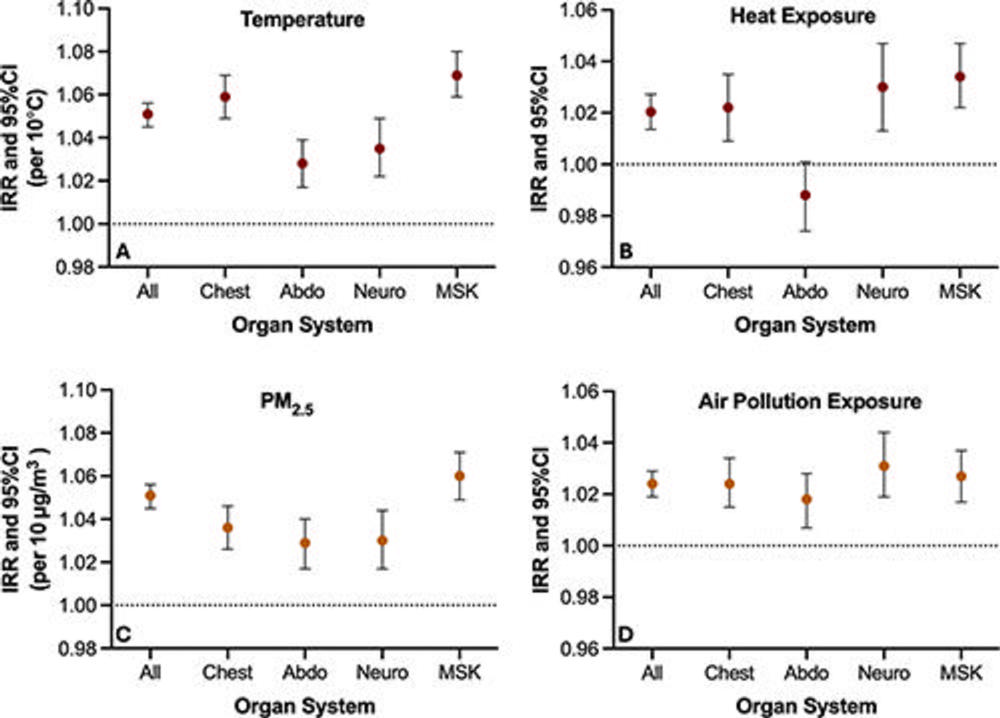 Heat and air pollution were associated with increased utilization of X-rays and CT, but not ultrasound or MR. High temperatures had a greater effect on X-ray utilization, while high PM2.5 levels were associated with higher CT utilization. Both environmental exposures were associated with increased utilization of chest, neuro and musculoskeletal imaging.