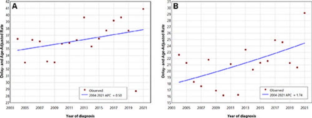 The annual percentage change among Black and Hispanic women was .86% and 1.6%, respectively. Among white women, there was an increase of 1.7% from 2004–2012, but no trend after that. Incidence rates of distant-stage breast cancers were 55% higher in Black women compared to white women.