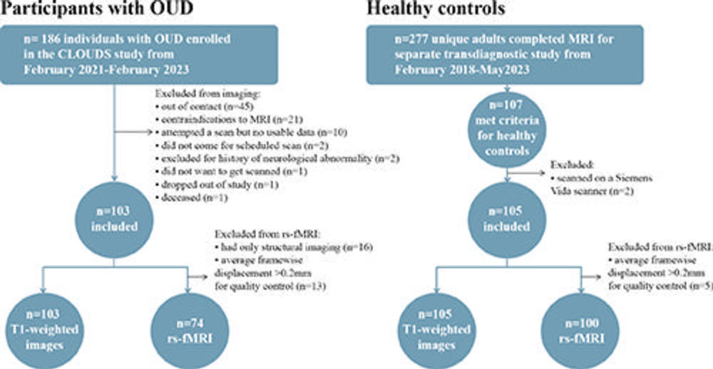 Researchers analyzed CLOUDS structural MRI data for 103 individuals with opioid use disorder and 105 individuals from the control group. They also analyzed the resting state fMRI data on 74 participants with opioid use disorder and 100 controls. The individuals with opioid use disorder were all recently stabilized with medication for the disorder (less than 24 weeks). The median age in the group with opioid use disorder was 37 years, and 40% were women. In the control group, the median age was 27 years, and 55% were women.