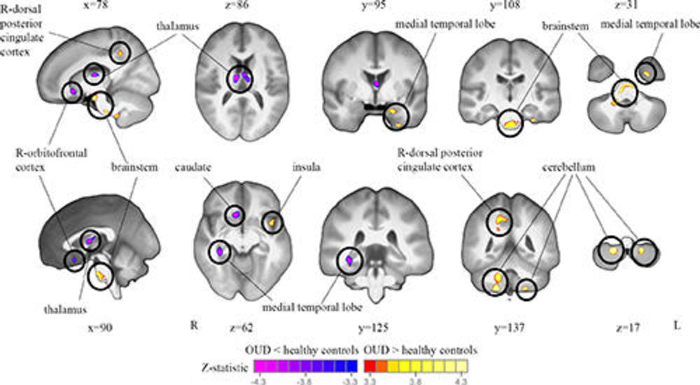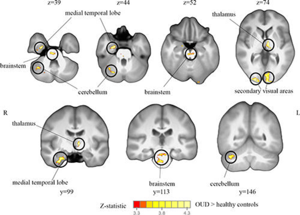 Whole-brain analysis revealed structural and functional alterations in opioid receptor-dense regions in the opioid use disorder group compared to healthy controls. In individuals with opioid use disorder, the thalamus and right medial temporal lobe of the brain were smaller in volume, while the cerebellum and brainstem were larger in volume than in controls. In the individuals with opioid use disorder, all these brain regions also had increased functional connectivity compared to controls.