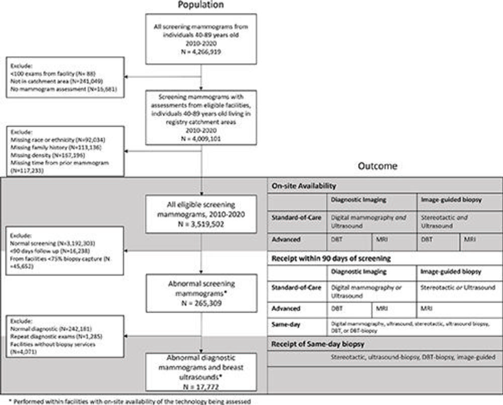 The data included over 3.5 million screening mammograms that were conducted on 1.1 million women at a total of 136 facilities located throughout the U.S. Of the 1,123,177 women, approximately 10% were Asian, 13% were Black, 6.5% were Hispanic, 68% were white, and 2.2% were "all others." Of the 9.3% of screenings that resulted in abnormal mammograms, 265,309 examinations were included in the analysis evaluating same-day services.