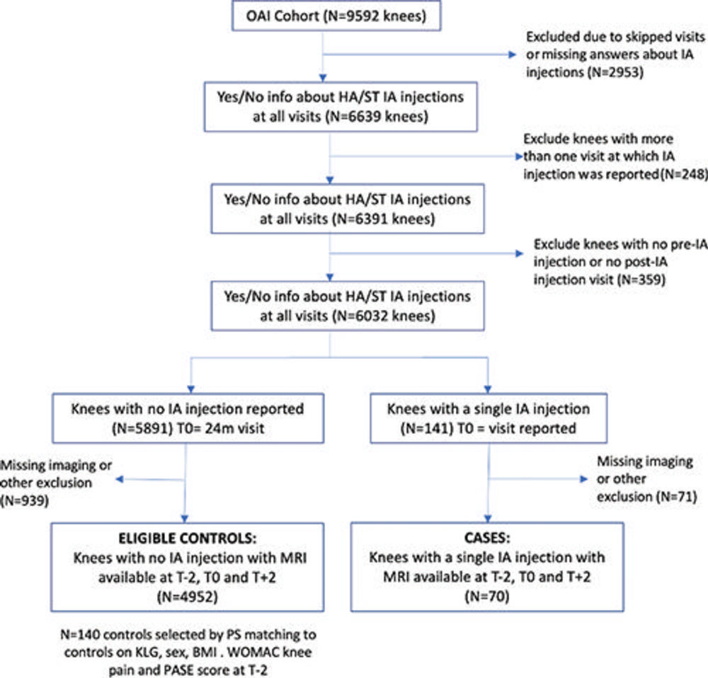 The research team looked at 70 participants who had one injection in the knee—either corticosteroid or hyaluronic acid—and who had knee MRIs taken before, at the time of, and two years after the injection. They used WORMS to assess how much damage had occurred in different parts of the knee joint over time. These scores were compared to a control group of 140 individuals with similar characteristics who did not receive any injection.