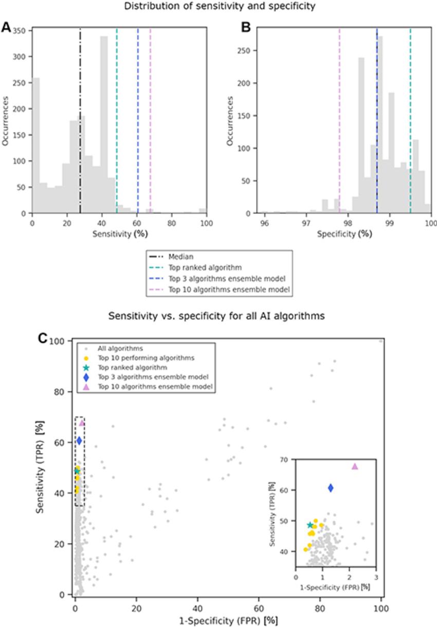 Altogether, the algorithms yielded median rates of 98.7% specificity for confirming no cancer was present on mammography images, 27.6% sensitivity for positively identifying cancer, and a recall rate—the percentage of the cases that AI judged positive—of 1.7%. When the researchers combined the top 3 and top 10 performing algorithms, it boosted sensitivity to 60.7% and 67.8%, respectively.