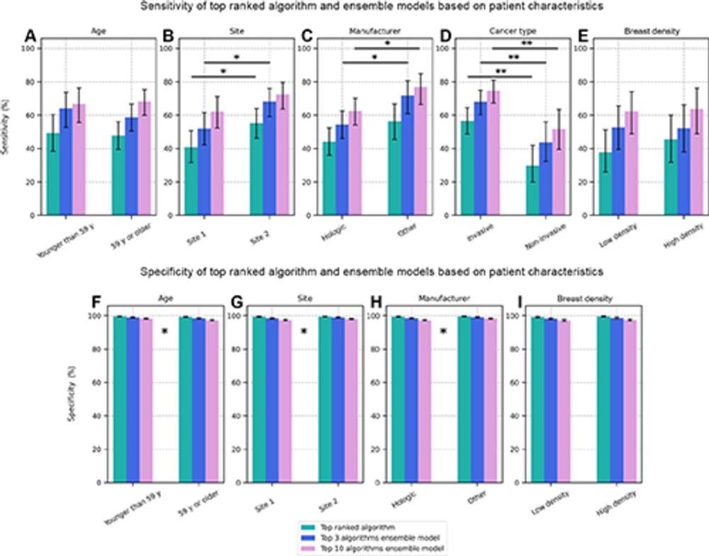 Individual algorithms showed significant differences in performance depending on factors such as the type of cancer, the manufacturer of the imaging equipment and the clinical site where the images were acquired. Overall, the algorithms had greater sensitivity for detecting invasive cancers than for noninvasive cancers.
