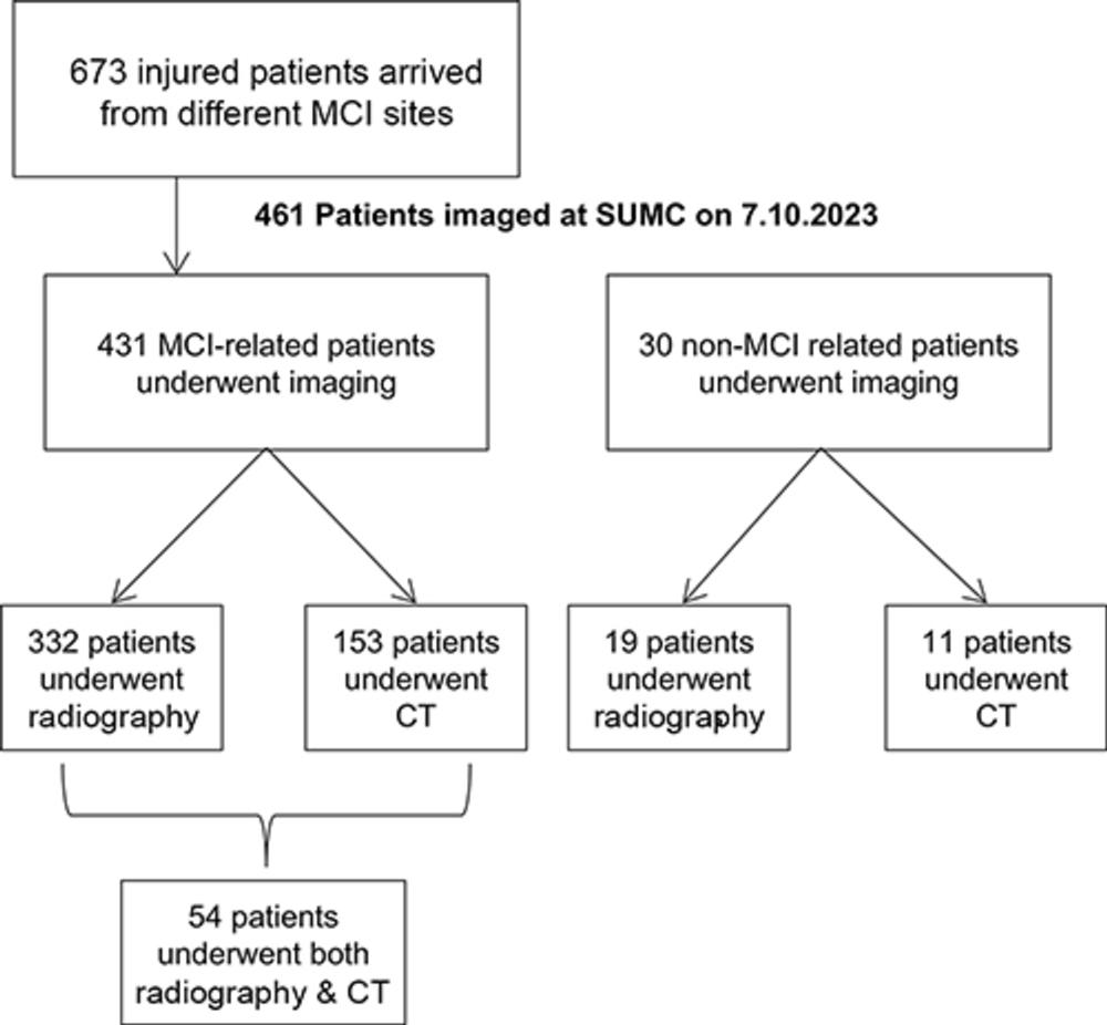Of the 673 casualties arriving at SUMC, 461 injured patients underwent imaging. Of these, 351 patients had X-rays, 164 had CT and 54 received both. Injuries ranged from blunt trauma caused by direct physical contact, to penetrating trauma involving guns, grenades and other explosive devices.