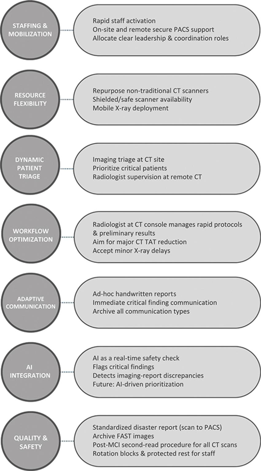The researchers offer generalizable tactics: staff surge and role clarity, imaging triage at the CT site, use of shielded, non-traditional scanners, and AI-enabled safety checks.
