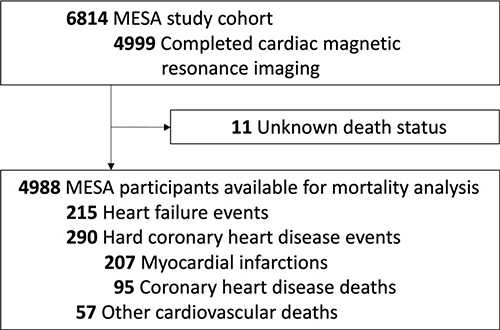 Flow diagram of events. Hard coronary heart disease events were a composite end point and included myocardial infarction and coronary artery disease–related death. The sum of myocardial infarction and coronary artery disease–related deaths does not equal the number of hard coronary heart disease events because some participants had myocardial infarction followed by coronary artery disease–related death. Other cardiovascular death excluded stroke and was adjudicated not to be atherosclerotic in origin (eg, pulmonary embolism, arrhythmia, and cardiomyopathy). MESA = Multi-Ethnic Study of Atherosclerosis.