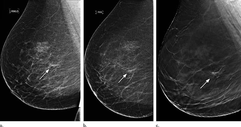Images in a 46-year-old asymptomatic woman who was recalled for asymmetry in the right breast that was assessed as benign on further diagnostic mammograms and in whom targeted US findings were normal. Full-field digital mammography findings were false negative, and biopsy re¬vealed intermediate ductal carcinoma in situ. (a) Right mediolateral oblique (MLO) and (b) lateral views. (c) Right MLO digital breast tomosynthesis (DBT) image shows an indeterminate spiculated density that was coded R3 indeterminate. Stereotactic-guided DBT biopsy was performed and revealed a papil¬loma with atypia. The patient underwent surgical diagnostic biopsy, which showed a 4-mm intermediate-grade ductal carcinoma in situ.
