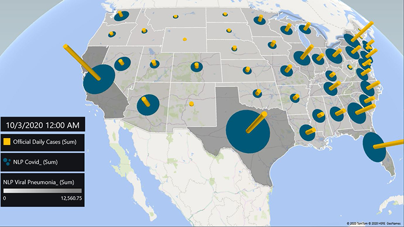 Above: The correlation between the size of the blue circles (Chest CT NLP Algorithm) and the height of the yellow vertical bars (official COVID-19 cases) in each state.